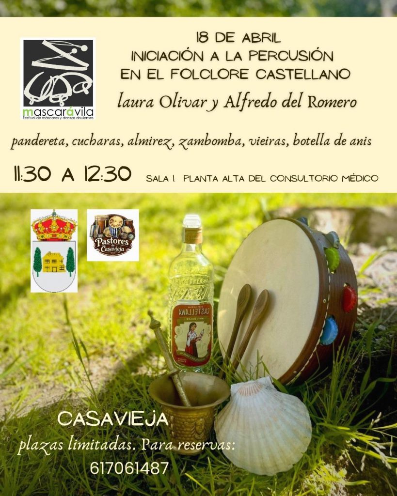 11.30ha 12:30hTaller de iniciación a la percusión en el folklore Castellano. Sala 1 planta alta consultorio medico.